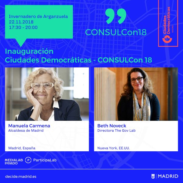 - La alcaldesa de Madrid, Manuela Carmena, inaugurará las jornadas el jueves 22 y firmará un convenio con GovLab, un centro de investigación de democracia participativa de EE. UU.
