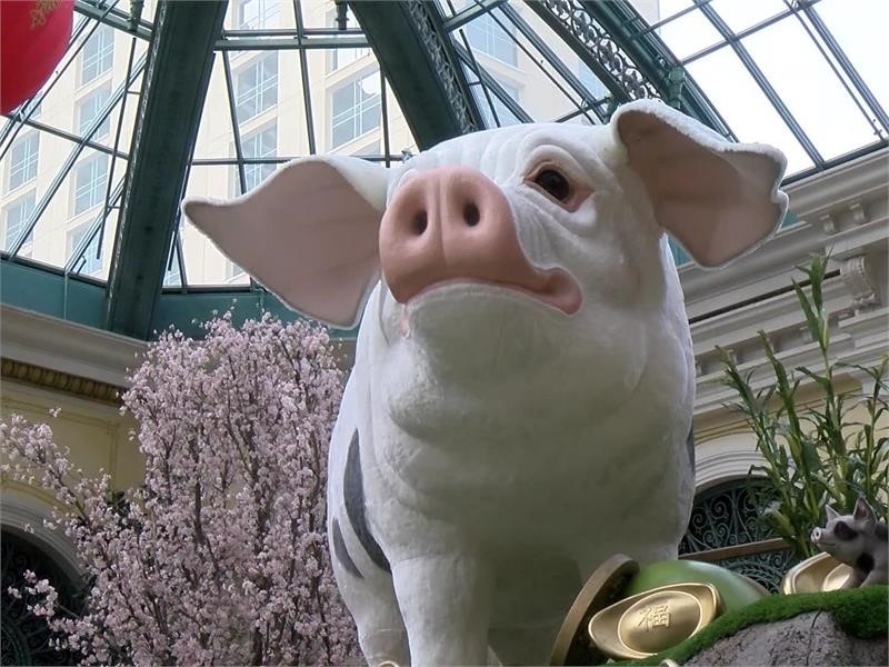 Some of the decor seen in Las Vegas this year includes the Bellagio Conservatory & Botanical Gardens which celebrates the Year of the Pig with a captivating display through the beginning of March. Four happy, golden pigs welcome guests as they enter the Conservatory through a breathtaking pavilion made of jade stone, which signifies wisdom, bravery and honesty. Five pendants crown the top of the rotunda, each individually decorated with a gilded dragon intended to watch over guests on their journey through the Conservatory.