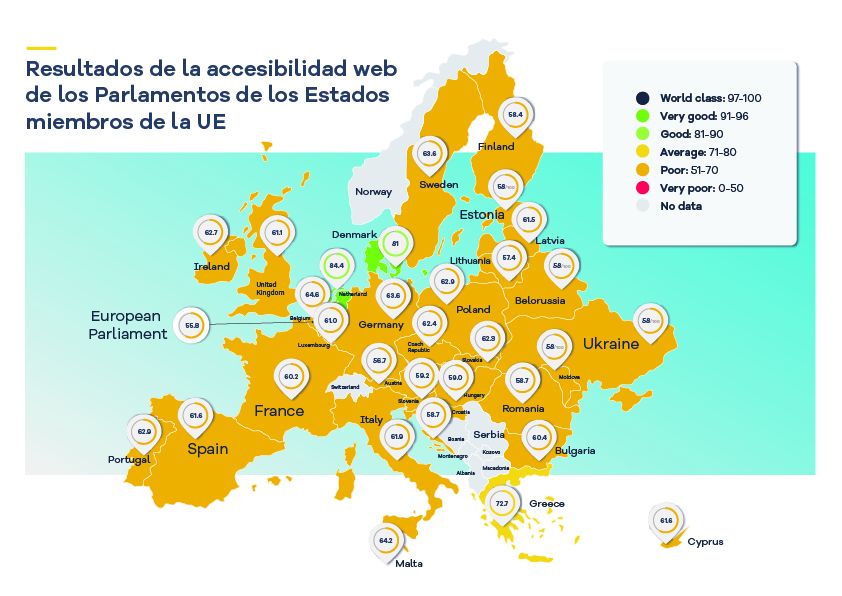 De los 28 países evaluados, 25 obtuvieron una puntuación baja, y solo Dinamarca y los Países Bajos demostraron proporcionar una buena experiencia de accesibilidad. También se ha revisado la web oficial del Parlamento Europeo que, con una puntuación DCI de solo 55,8, es el sitio web más inaccesible de todos.