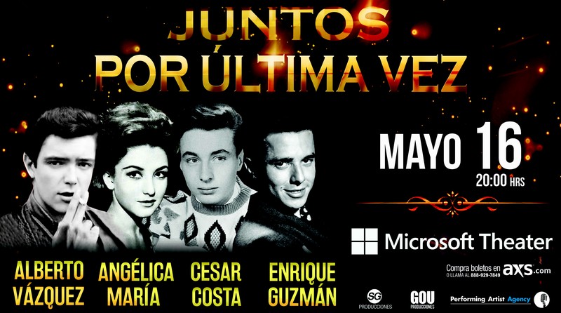 Vesper Public Relations. Marzo 2019. Los Ángeles, CA. Después de un éxito avallasador , logrando 13 exitosas presentaciones ‘Sold Out’ en el Auditorio Nacional de la ciudad de México y a lo largo del país los grandes del rock, Enrique Guzmán, Angélica María, César Costa y Alberto Vázquez, llegarán a Los Ángeles con su gira “Juntos por última vez”.