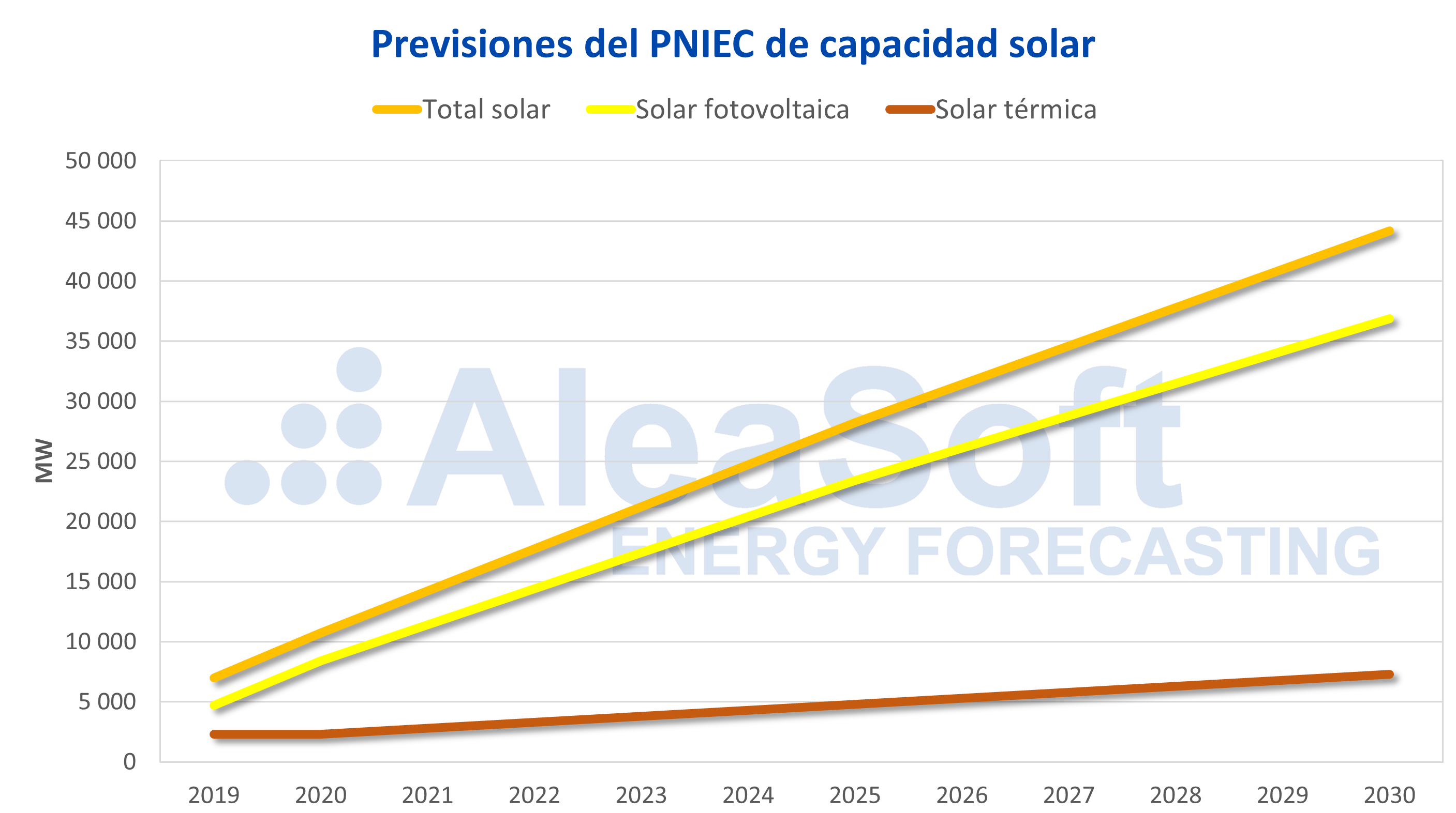 El Plan Nacional Integrado de Energía y Clima (PNIEC) publicado recientemente propone un aumento muy importante de la capacidad renovable, y destaca la solar con la instalación de más de 37 GW nuevos en todo el territorio nacional, lo que representa un incremento del 530% comparado por ejemplo con el 114% esperado para la eólica. De estos 37 GW solares del PNIEC, 32 GW corresponden a la fotovoltaica y 5 GW a la termosolar.