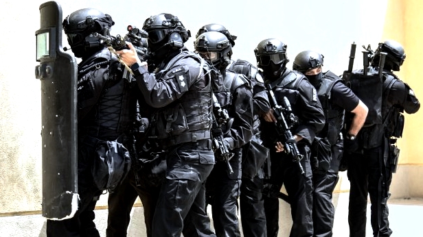 Just as Special Forces Soldiers moved in, the Kuwait SWAT team rolled into the compound, dismounted and organized along an exterior building wall in a tactical, breaching formation. Once given the signal, the SWAT team methodically swept through the building room by room, where they found terrorists, a chemical lab and WMDs.