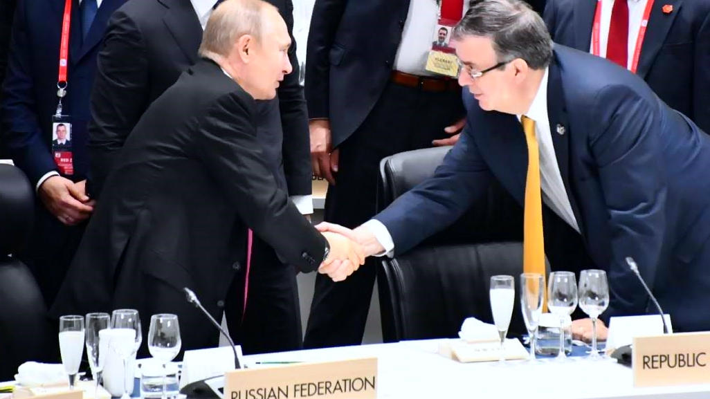 Russian president Vladimir Putin friendly handshake foreign minister of Mexico Marcelo Ebrard during the G20 summit in Osaka Japan