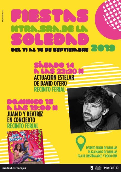 El distrito de Barajas se prepara un año más para celebrar sus fiestas patronales de Nuestra Señora de la Soledad, que se desarrollarán del 6 al 22 de septiembre, y en las que la música será la gran protagonista junto a las actuaciones infantiles, los torneos deportivos y de mesa, los bailes, el castillo de fuegos artificiales y el tradicional traslado de la imagen de Nuestra Señora de la Soledad.
