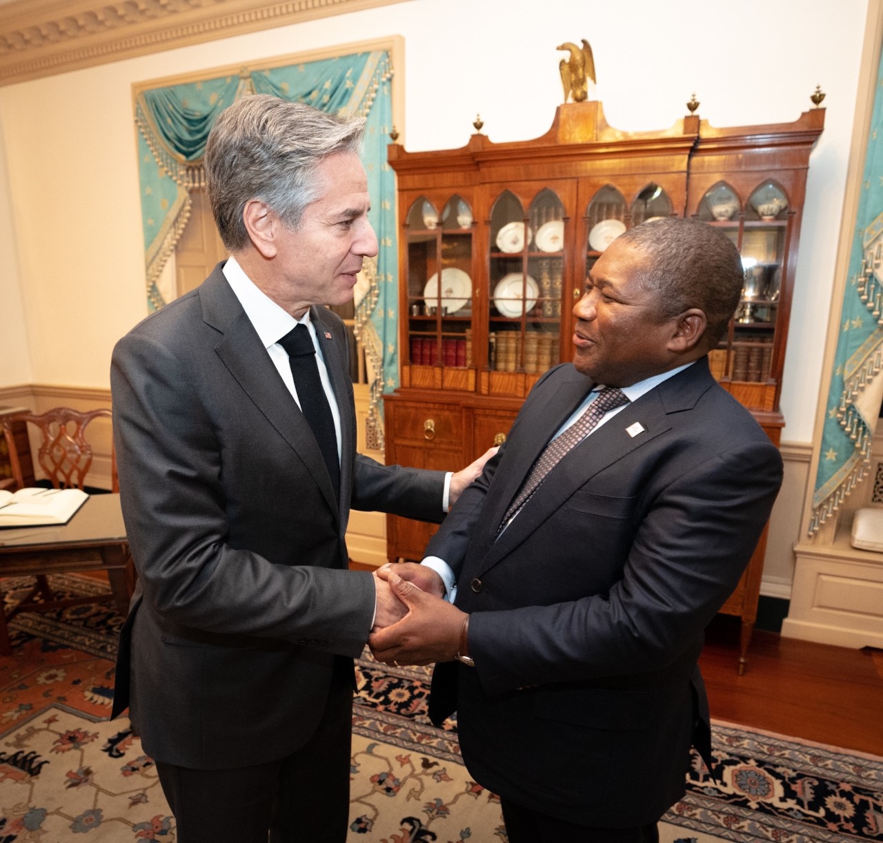 SECRETARY BLINKEN: Good evening, everyone. It’s a pleasure to welcome President Nyusi of Mozambique here to the State Department. We are very much looking forward to our collaboration when Mozambique becomes a member of the United Nations Security Council in January, but we’re also strong partners – strong partners in helping Mozambique build stability, strong partners in building out global health together, dealing with food insecurity, and we really welcome that partnership. There’s lots to discuss this evening, but Mr. President, thank you very much for being here, coming to the State Department, and for being in Washington this week for the summit.